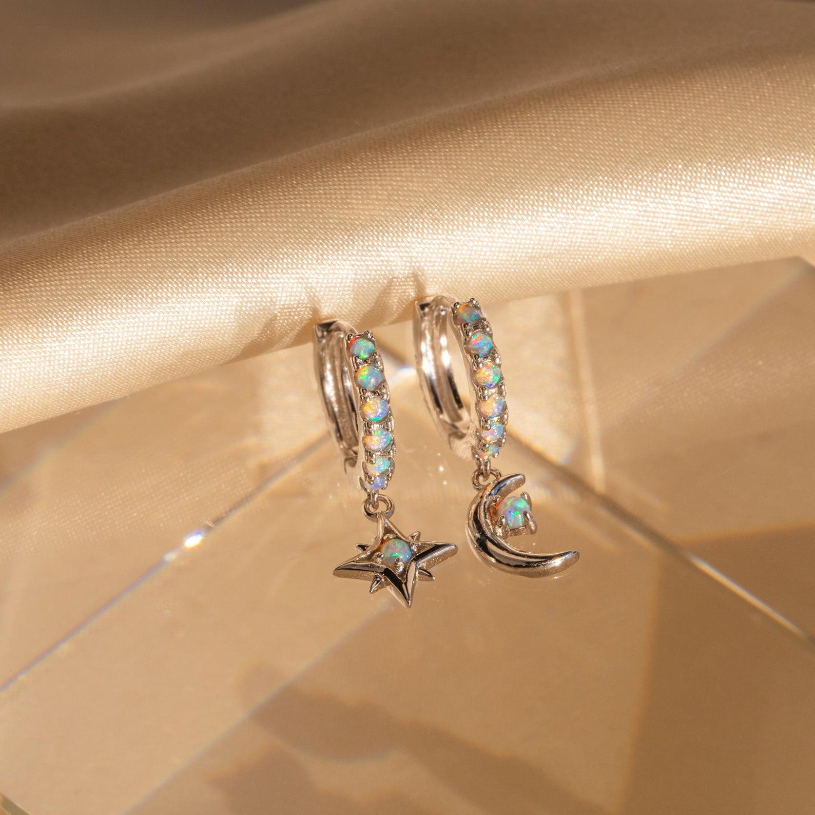 • Featuring Opal Huggie Hoops with dangling Moon and Star charms