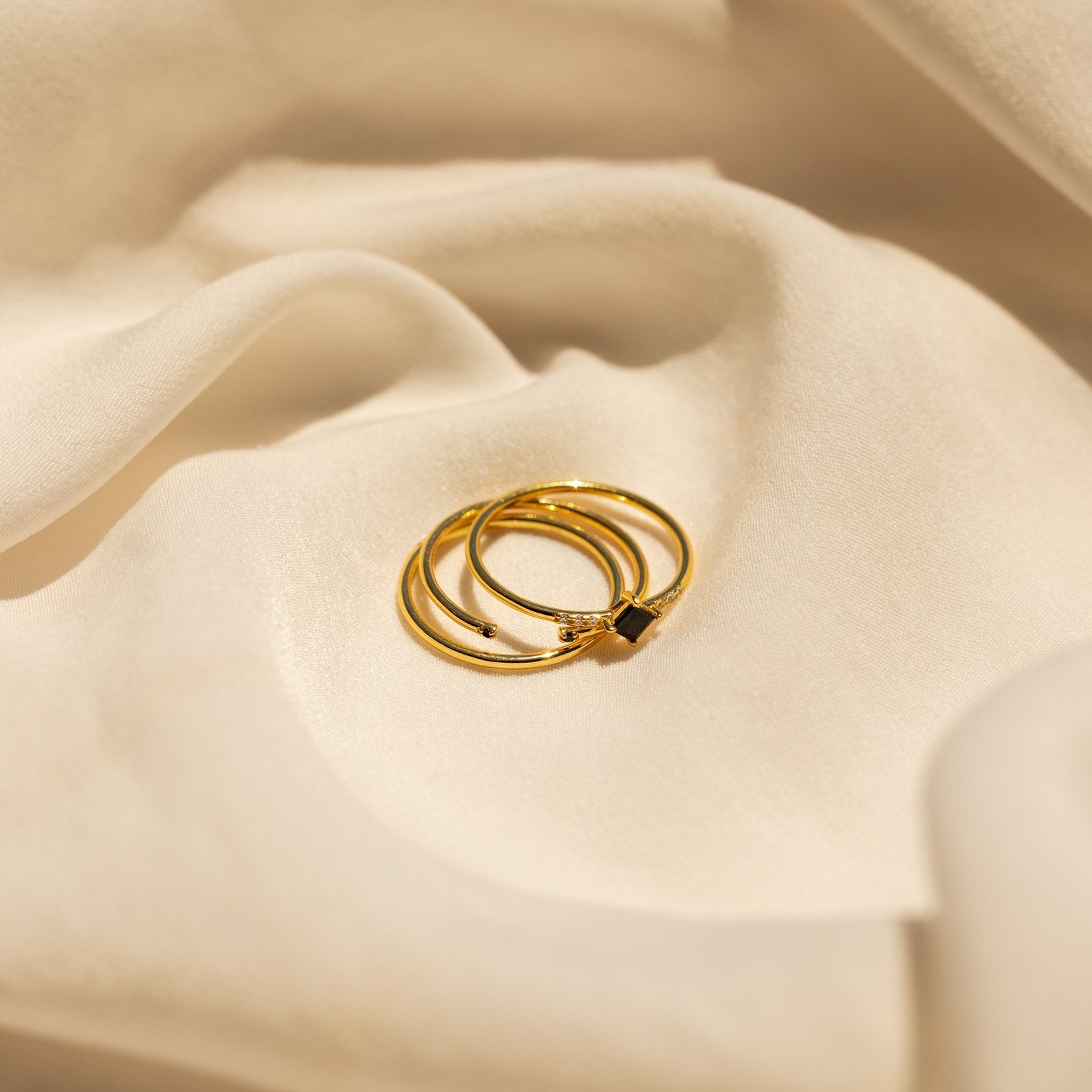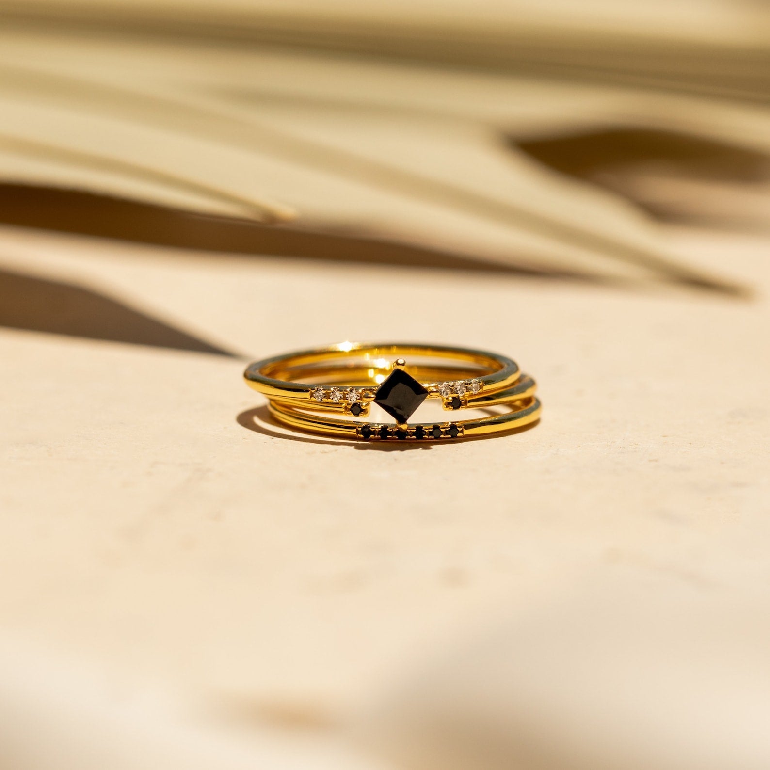 Bask in the luxuriousness of our Black Abyss Ring Set. If you need to expand your jewelry collection from the typical, these are the perfect rings to do just that. The black gemstones give you the lavish essence you are seeking while the daintiness of the ring bands make it wearable for everyday.