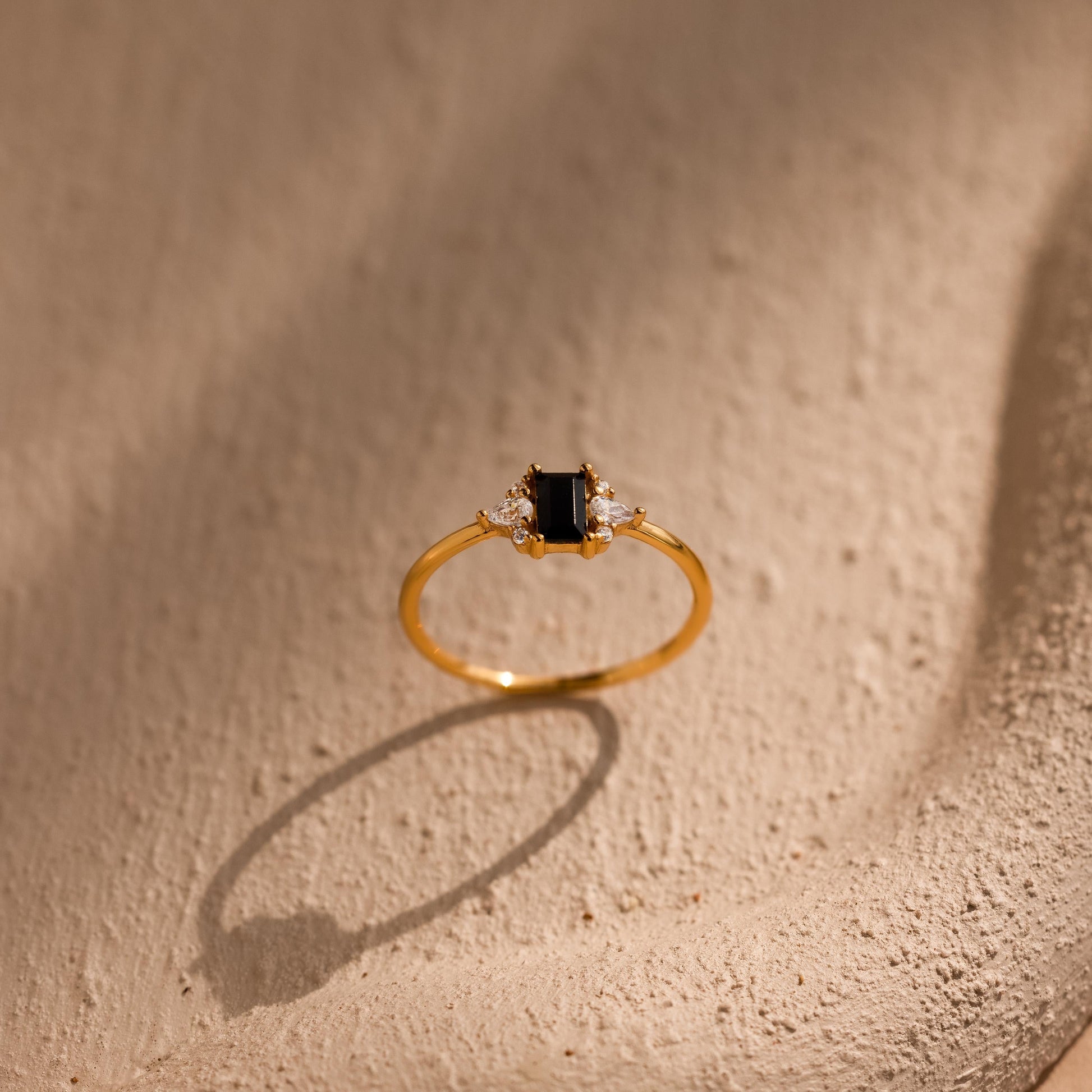Introducing our Black Baguette Ring, a striking piece that exudes elegance and sophistication. Featuring a baguette-cut centerpiece surrounded by delicate teardrop diamonds, this ring adds a dramatic accent to any look, making it the perfect statement piece for those who appreciate vintage style and bold glamour ♡