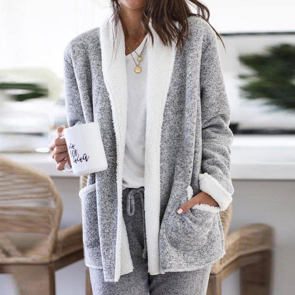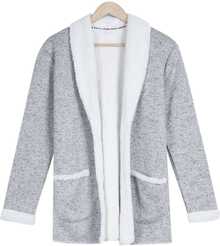 Get your cozy on wearing this oversized double pocket open cardigan jacket! This super-snuggly cardigan features a soft pebble gray and creamy white trim, giving it an elevated style that makes this comfy cardigan great for work, at home, errands, and traveling. Pair this cardigan jacket with jeans, slacks, a blouse, or camisole. Wash in gentle or delicate cycle with light colors. Keep away from dark colors. The delicate fabric may absorb dark colors.