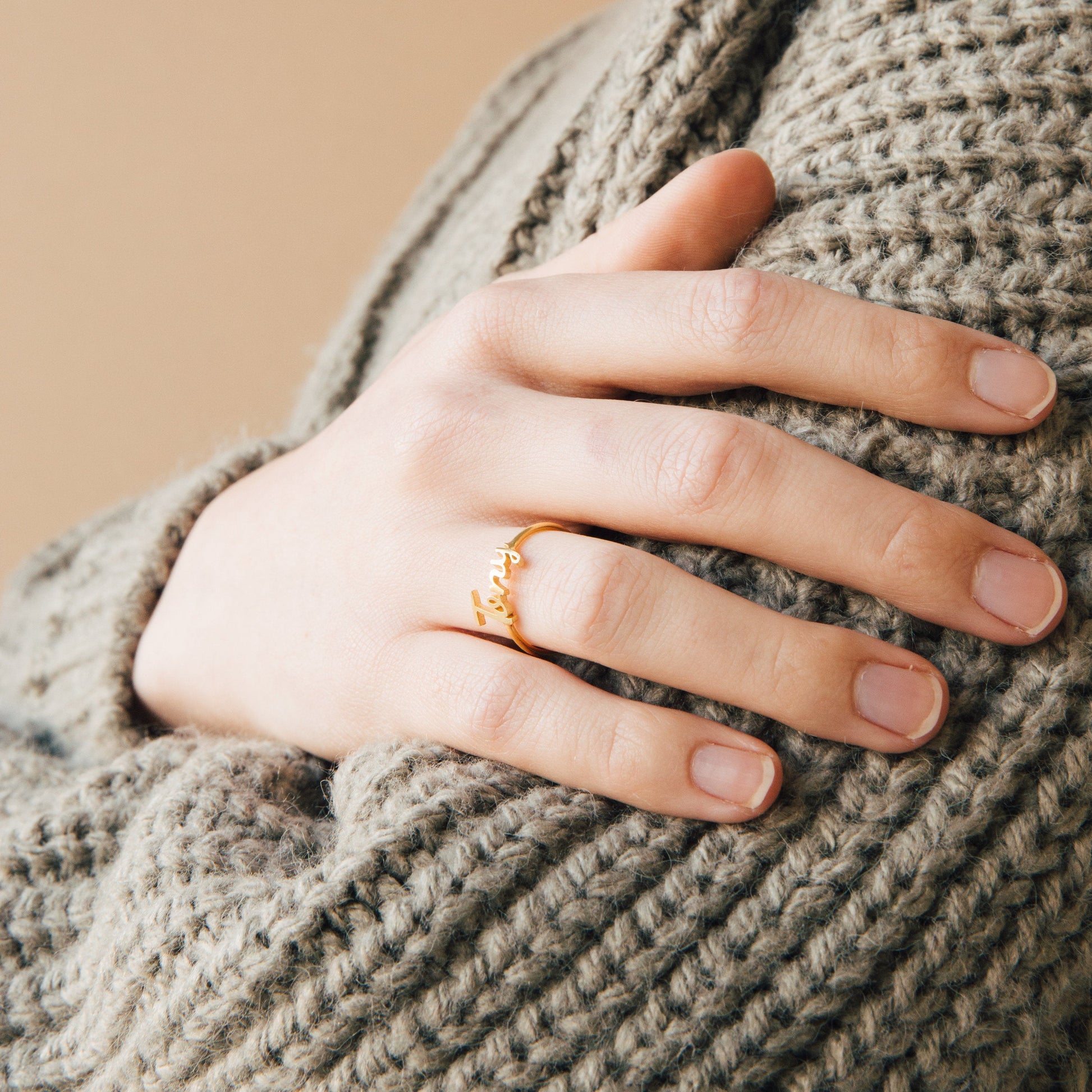 The Grace Script Name Ring is crafted with a stunning script font, in the lettering of your choosing. This personalized piece will immediately become a part of your daily rotation.