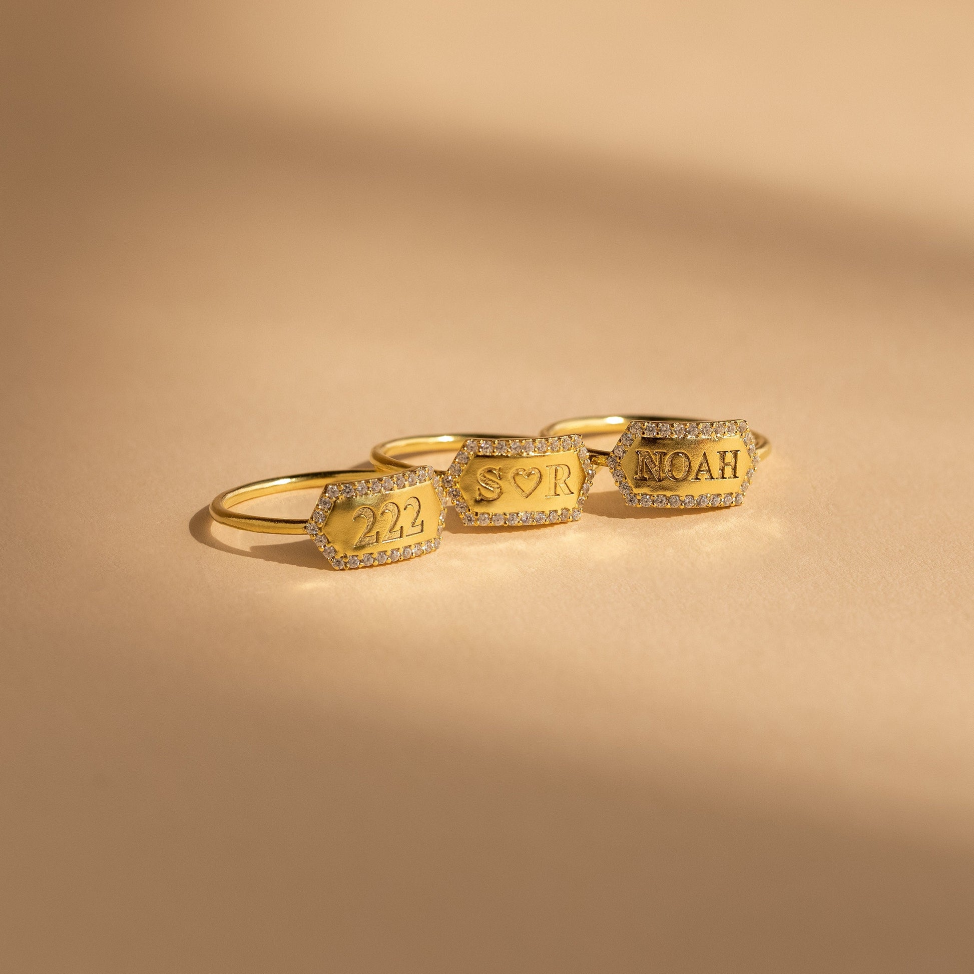 Our Engraved Hexagon Ring will set you apart with its unique charm shape and sparkling pave stones. Personalize this minimalist ring with a date, initials or anything that means the most to you and create something meaningful you won’t want to take off.