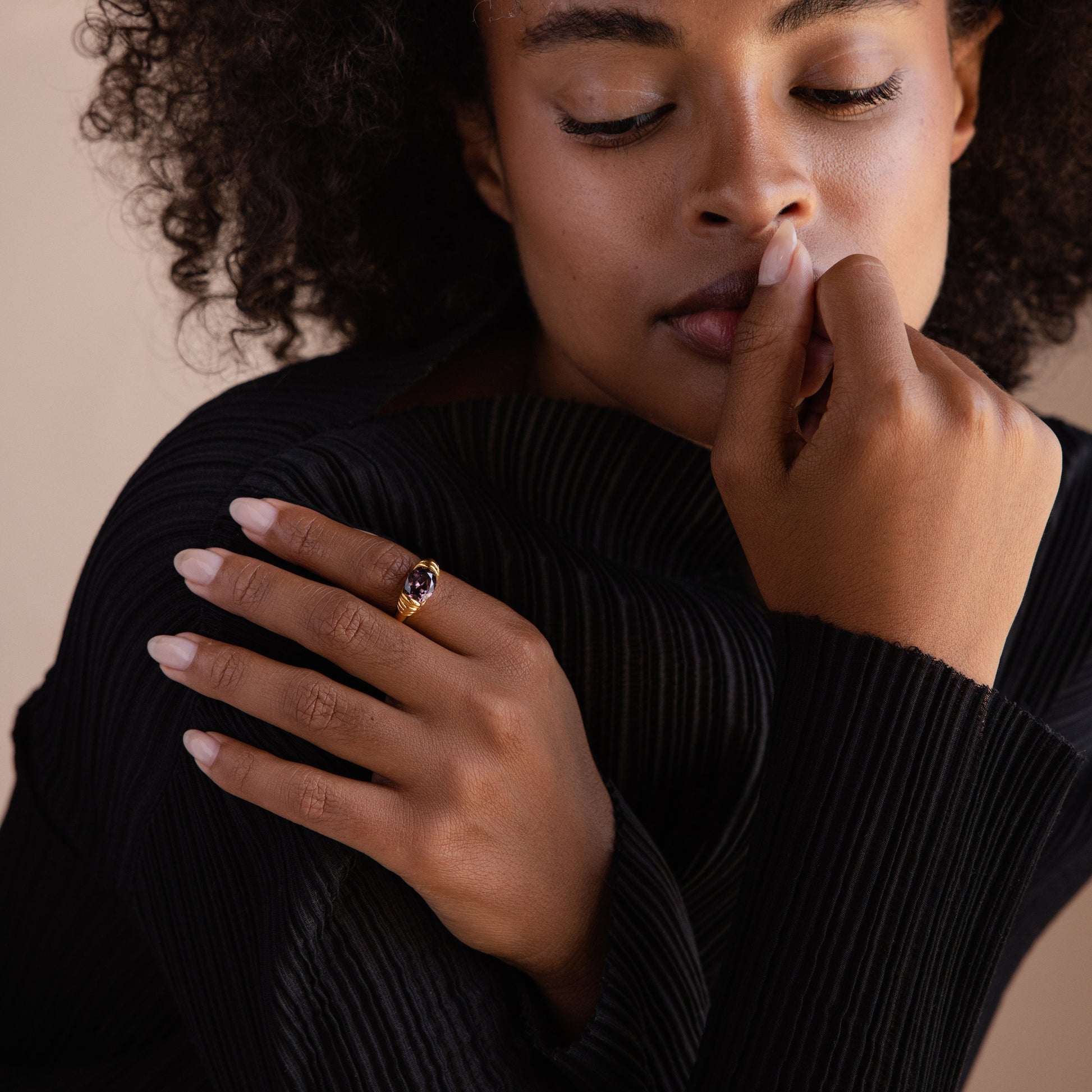 Elevate your style with our Dark Amethyst Signet Ring, a vintage-inspired statement piece reminiscent of the Art Deco era ♡ This bold and versatile ring, featuring a captivating Dark Amethyst gemstone, adds a touch of retro glamour and can be worn as a striking cocktail ring or a chic chunky accessory for any occasion.