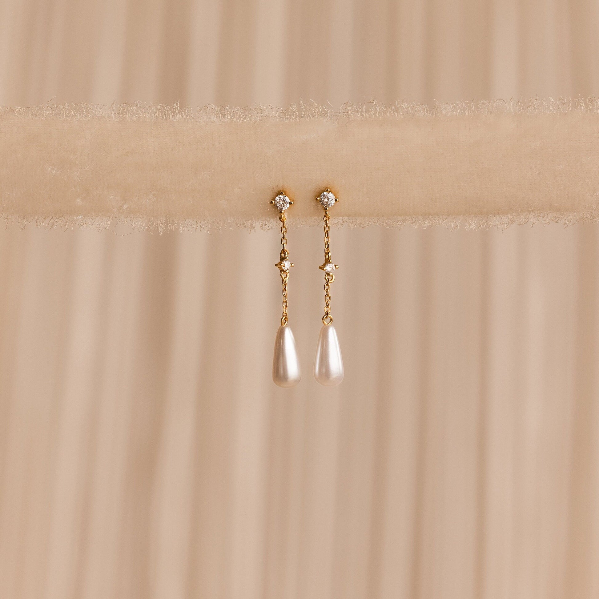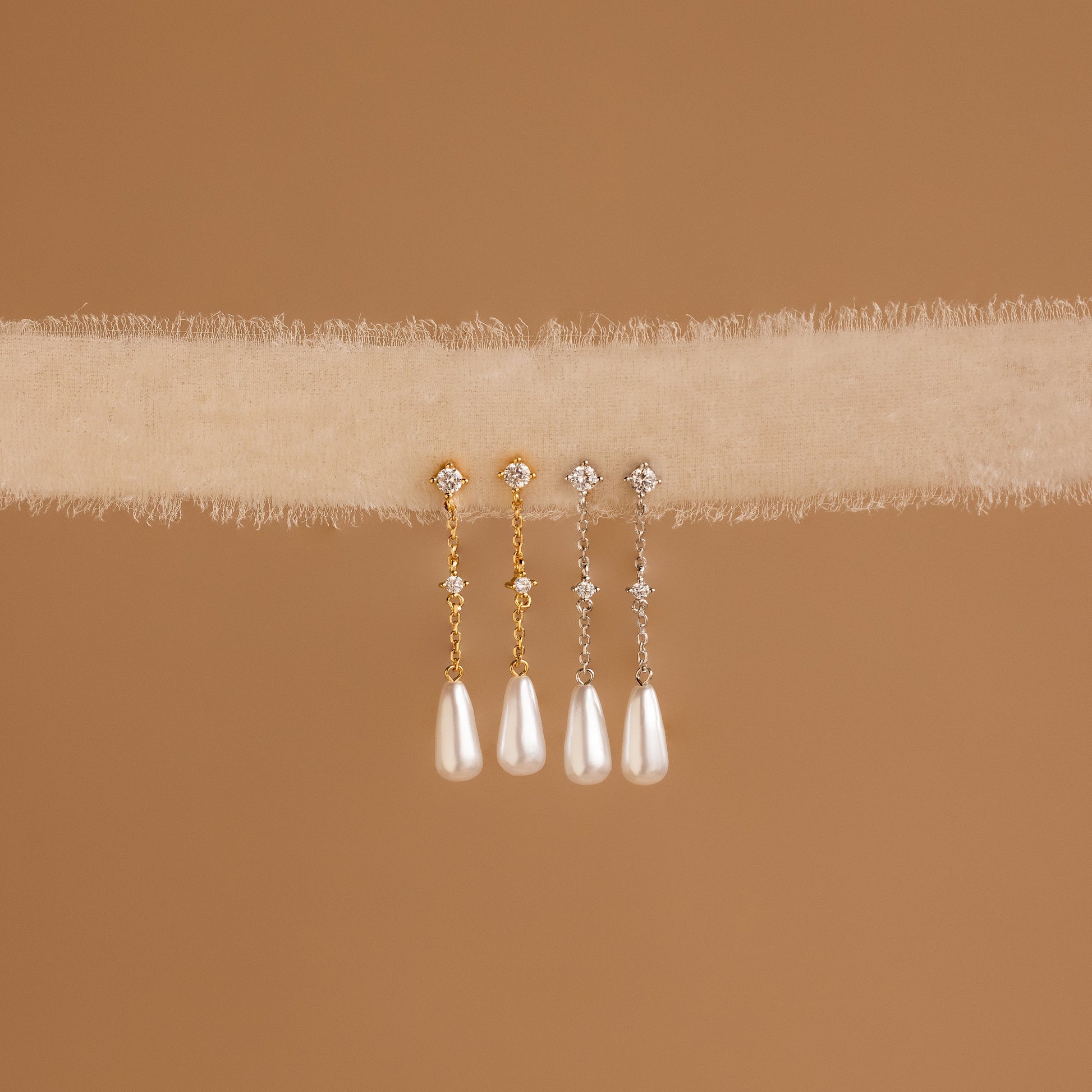 Our Diamond Pearl Chain Earrings are perfect for luxury nights out with its timeless elegance. Featuring classic Diamond Studs with a Pearl Teardrop Charm dangling down from a chain, these earrings effortlessly blend sophistication with contemporary style. Whether it's for a classy wedding or a fancy dinner with friends, these are sure to become your new favorite statement piece for any celebration!