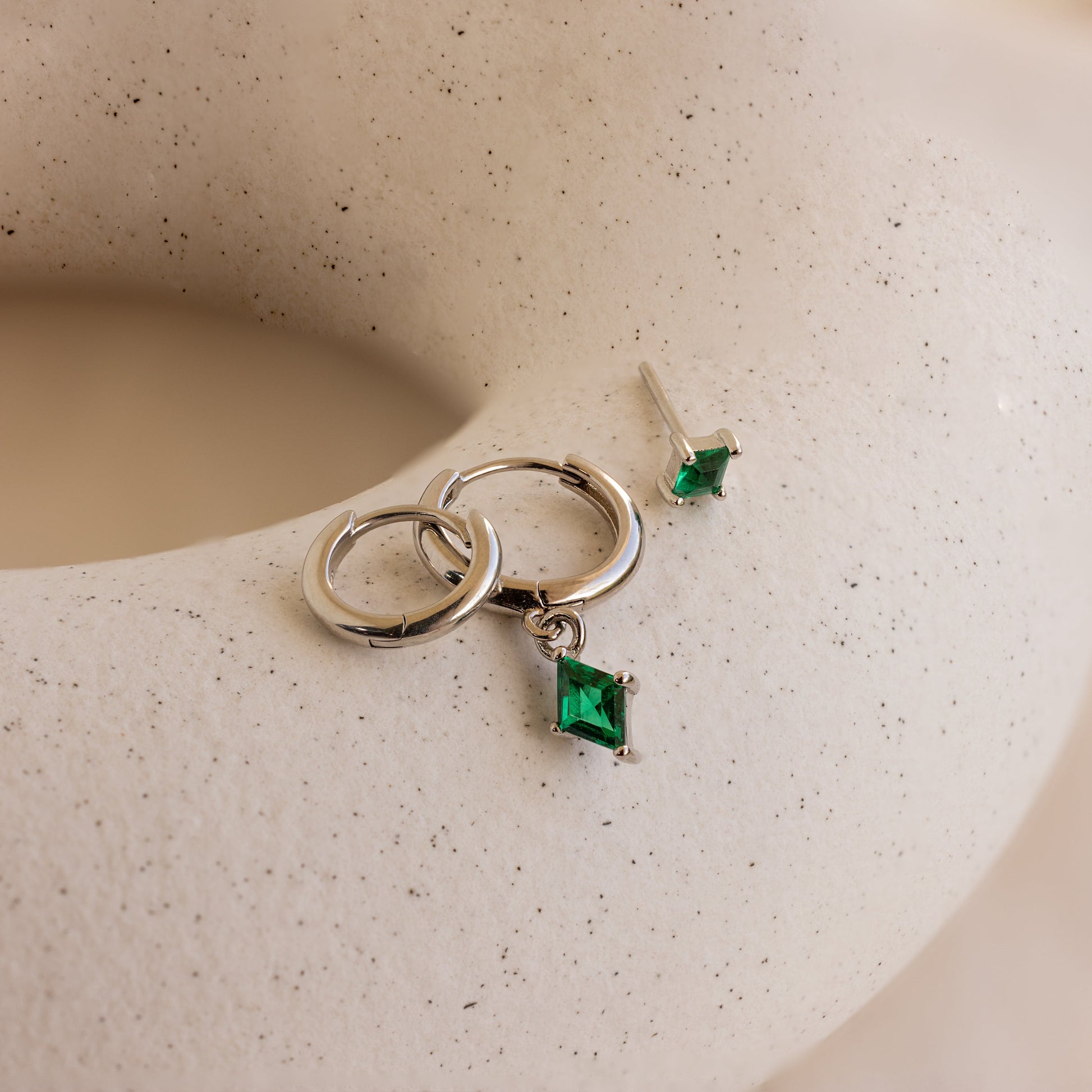 • ~7x5mm dangling Emerald Charm on a Huggie Hoop with ~8.5mm Inner Diameter and ~12mm Outer Diameter