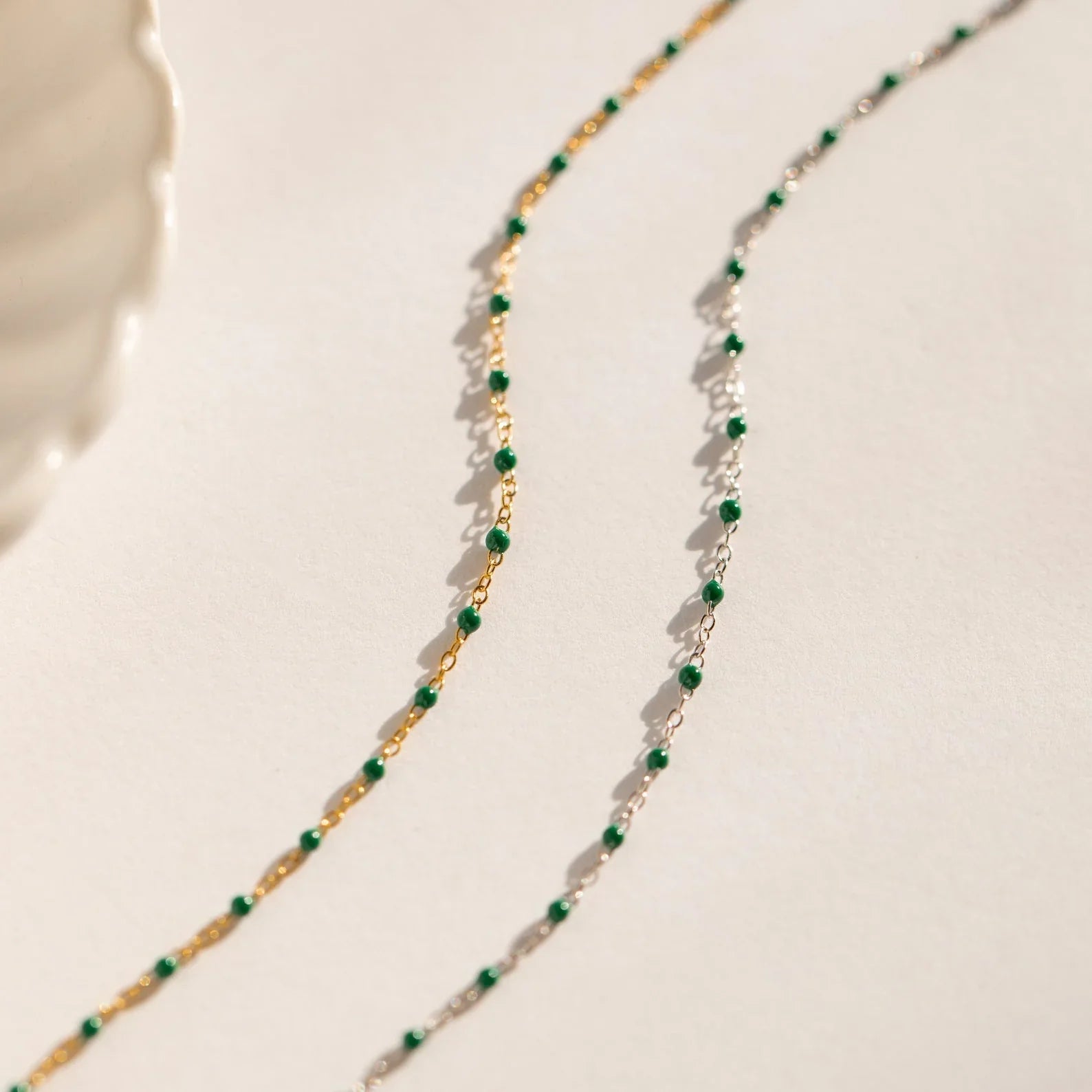 • Style A) Beaded Necklace with ~2mm Emerald Green Beads spaced ~5mm apart, with adjustable 16 to 18 inch chain