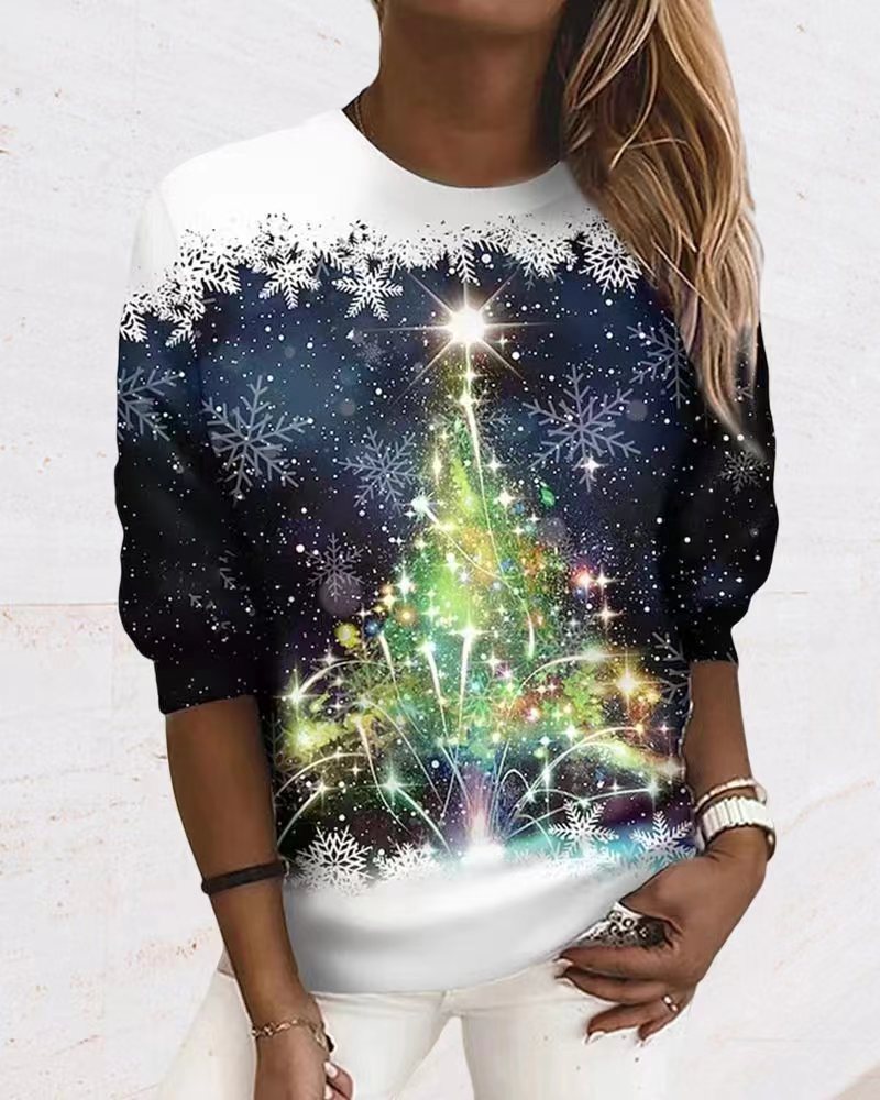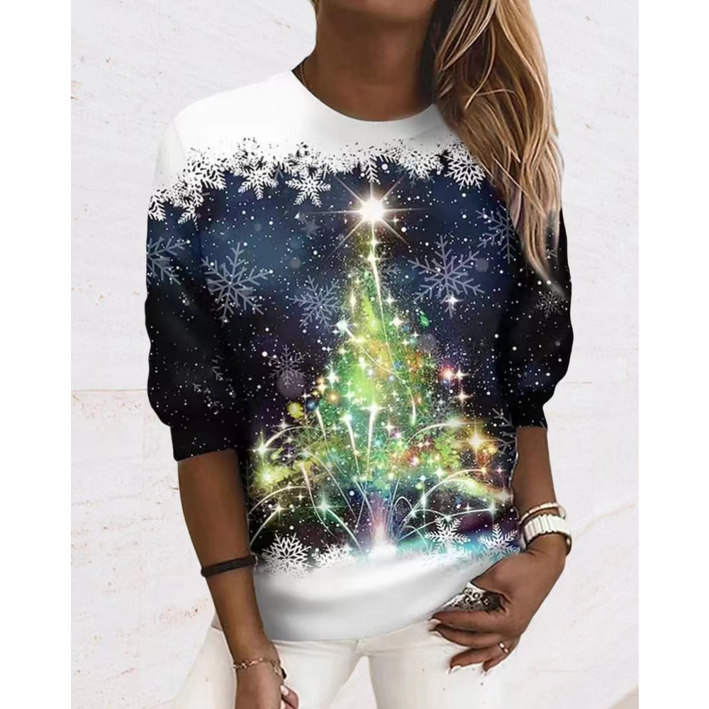 SPREAD HOLIDAY CHEER WITH GLAMOR BY WEARING THIS GOLD PRINT CHRISTMAS TREE SHIRT. SWIRLING RIBBONS WITH A BOW TIE ON TOP OF THE CHRISTMAS TREE ADD A LUXE APPEAL TO THIS BLACK LONG SLEEVE TOP, GIVING IT A SOPHISTICATED LOOK PERFECT FOR A HOLIDAY PARTY, DATE, OR NIGHT OUT. COMPLEMENT THIS EYE-CATCHING DESIGN WITH GOLD LIGHTWEIGHT LAYERING NECKLACES AND HOOPS.