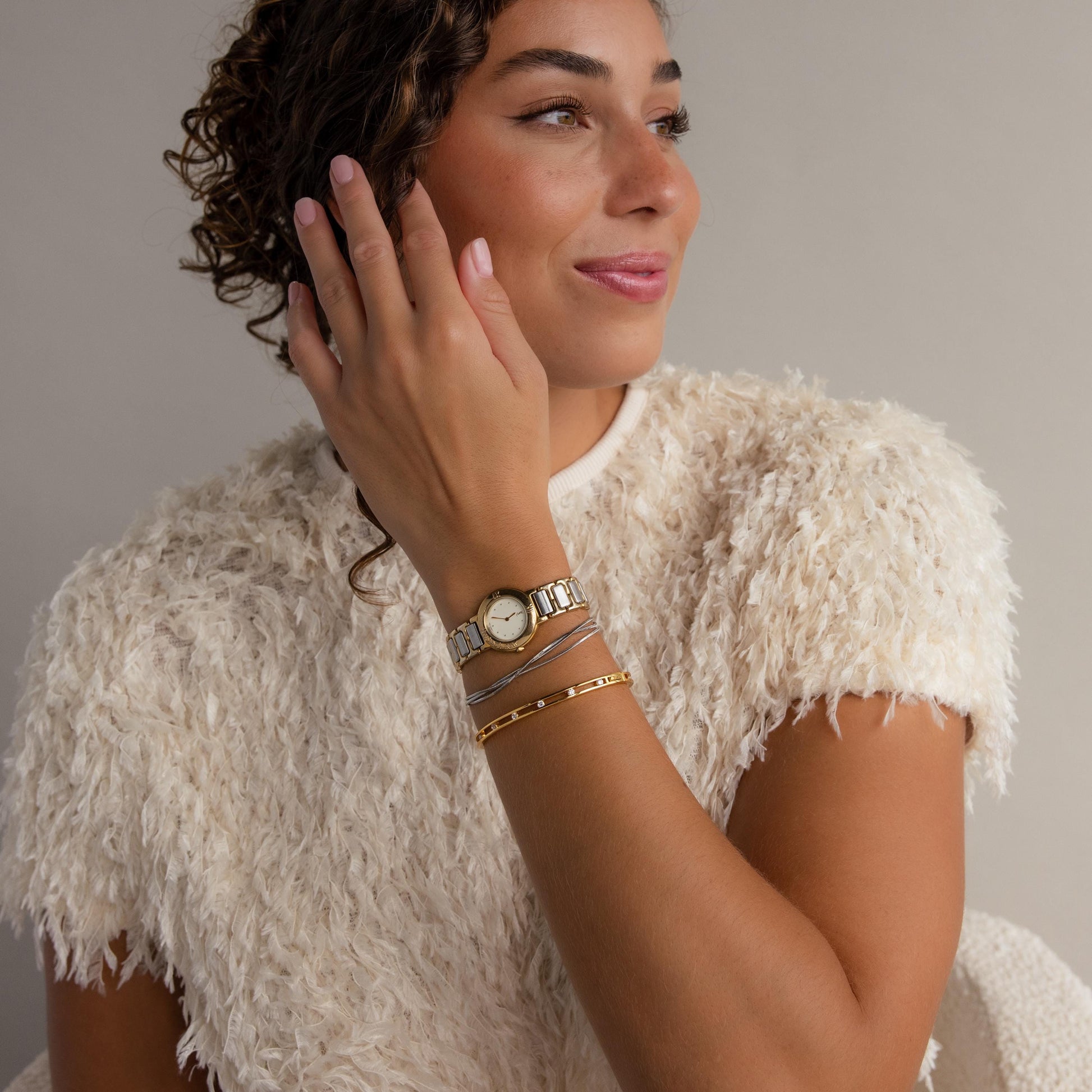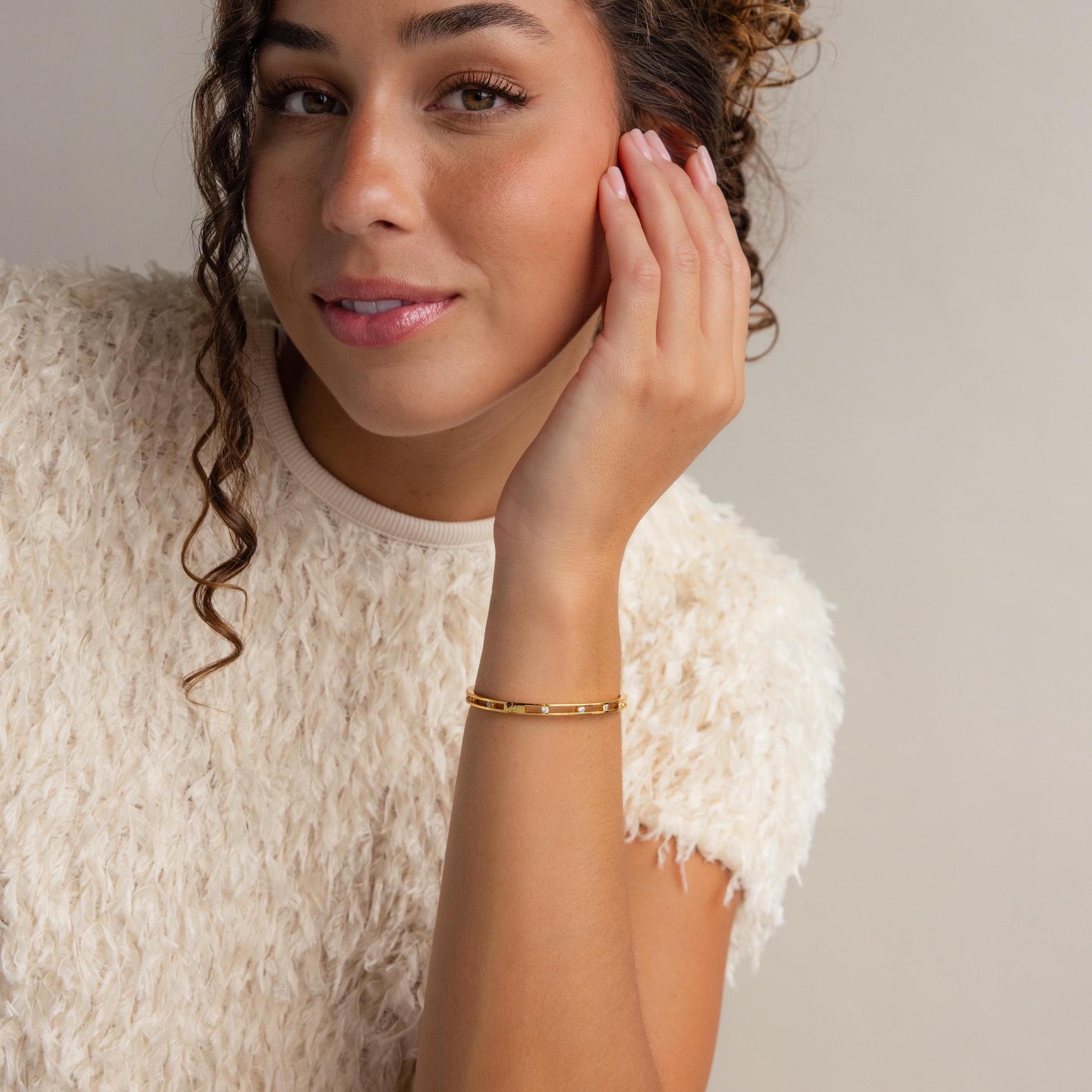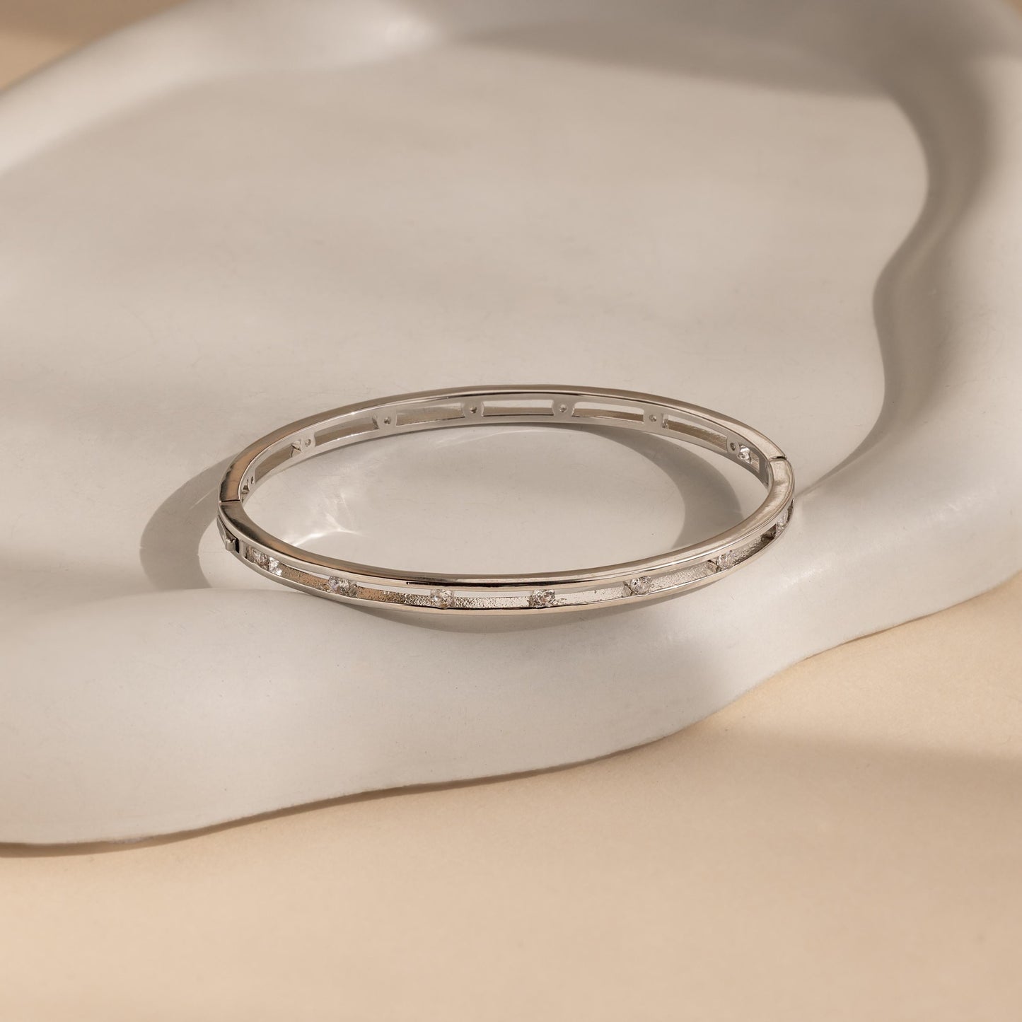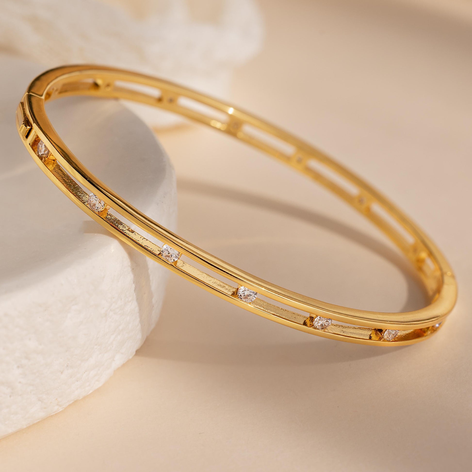 Our Lace Diamond Bangle features a sleek, open station design adorned with round diamonds, offering a shimmery yet sophisticated look. Perfect for dressing up or adding a bit of luxury to your everyday style, it's a must have piece for anyone who loves a little extra sparkle.
