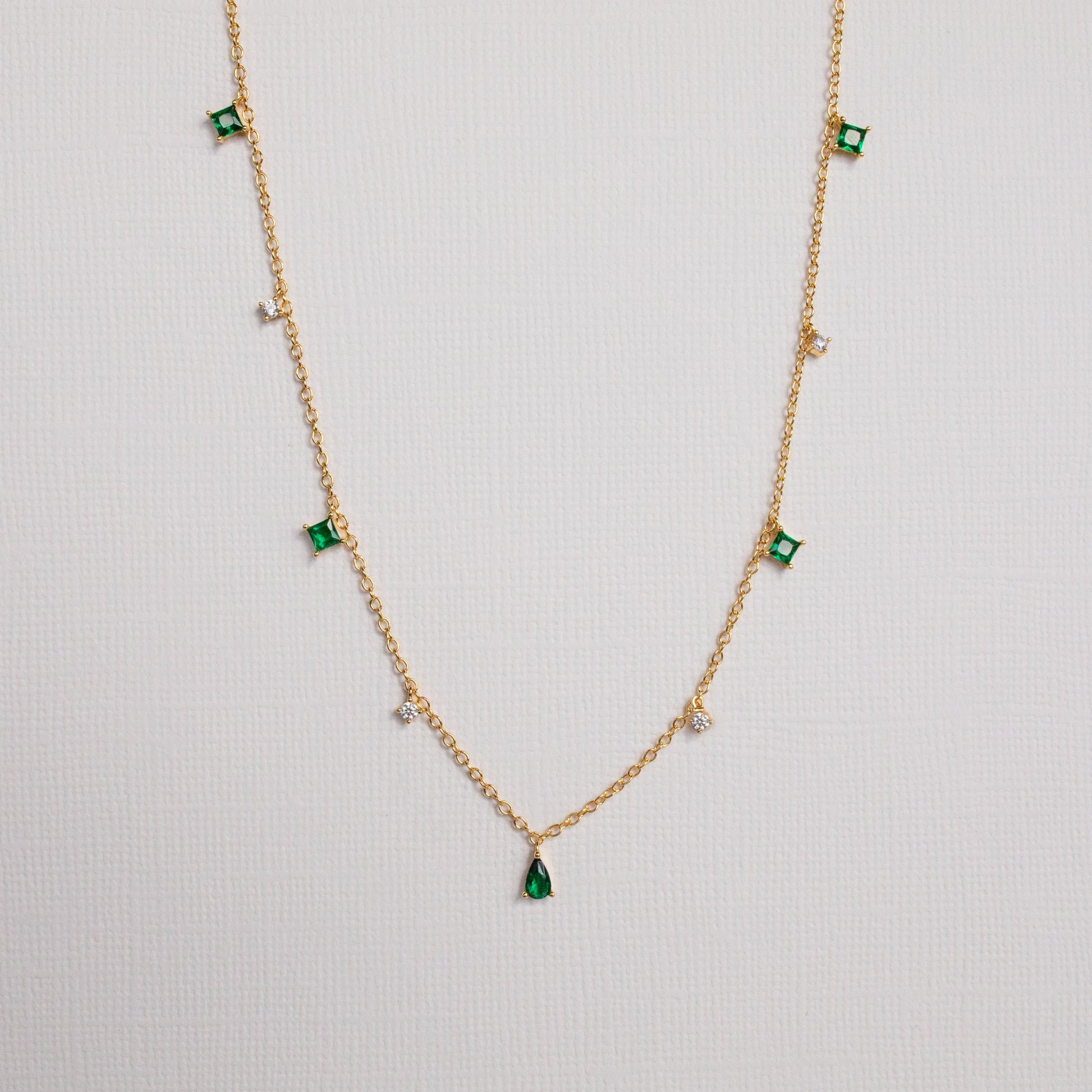 • Featuring ~5.5mm Pear cut and ~5mm Princess cut CZ Emerald gemstones, and ~3mm Round CZ Diamonds dangling on an adjustable cable chain from 16 inches to 18 inches
