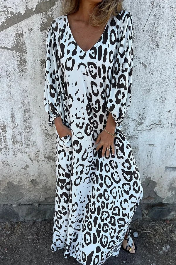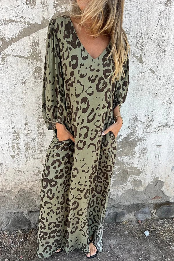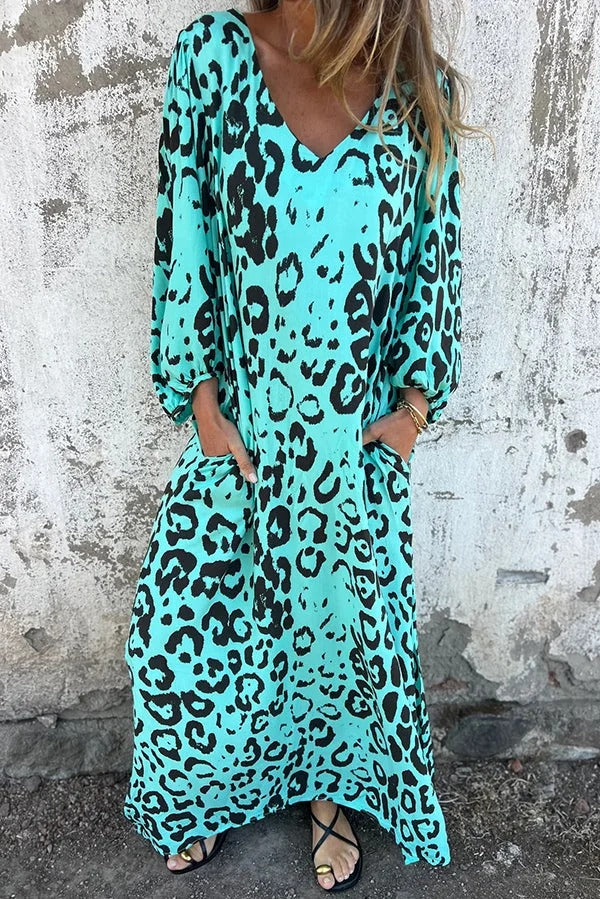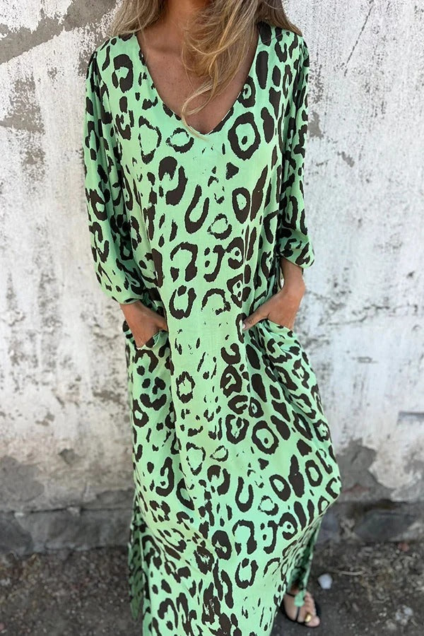 Leopard Print Loose V-neck Pocket Holiday Style Maxi Dress