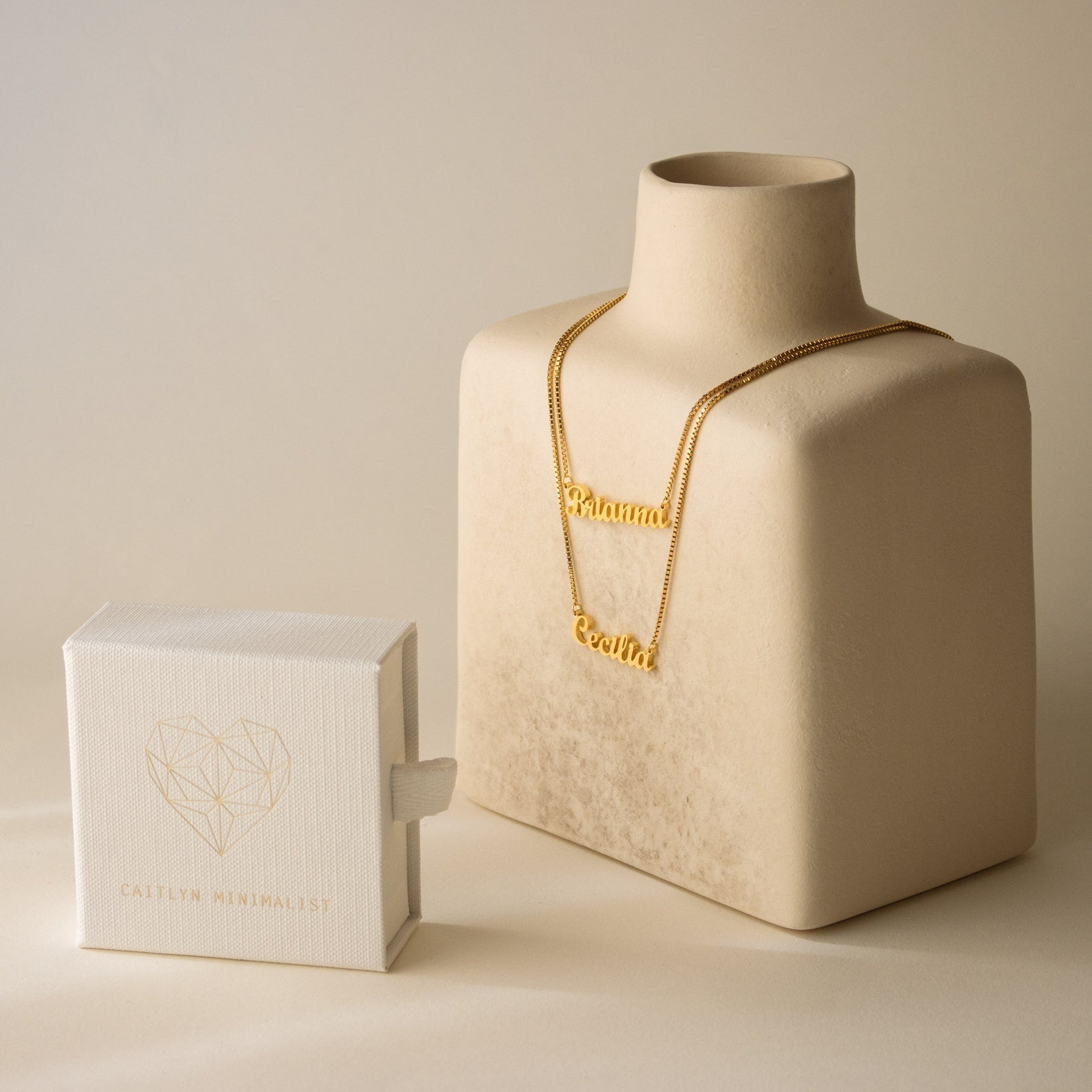 Dainty and timeless, this chic font is sure to elevate any outfit. Along with having two names in one, the London Double Name Necklace sits on a sparkly box chain adding some extra oomph to your everyday outfit. Perfect for yourself or for gifting on a special occasion.