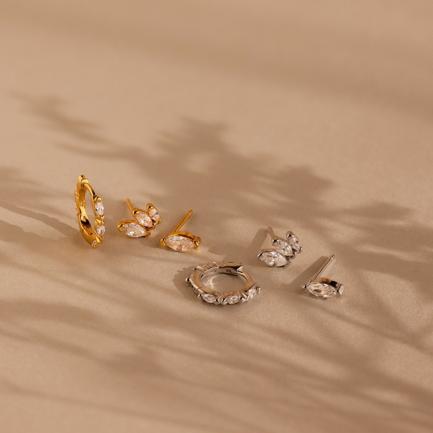 Introducing our Marquise Diamond Earrings Set: a stunning trio comprising a classic Marquise Stud, a dazzling Triple Marquise Floral Stud, and an elegant Triple Marquise Hoop Earring. Designed to enhance wedding elegance and ideal as bridesmaid gifts, this set exudes timeless beauty and sophistication, adding an extra sparkle to your special day.