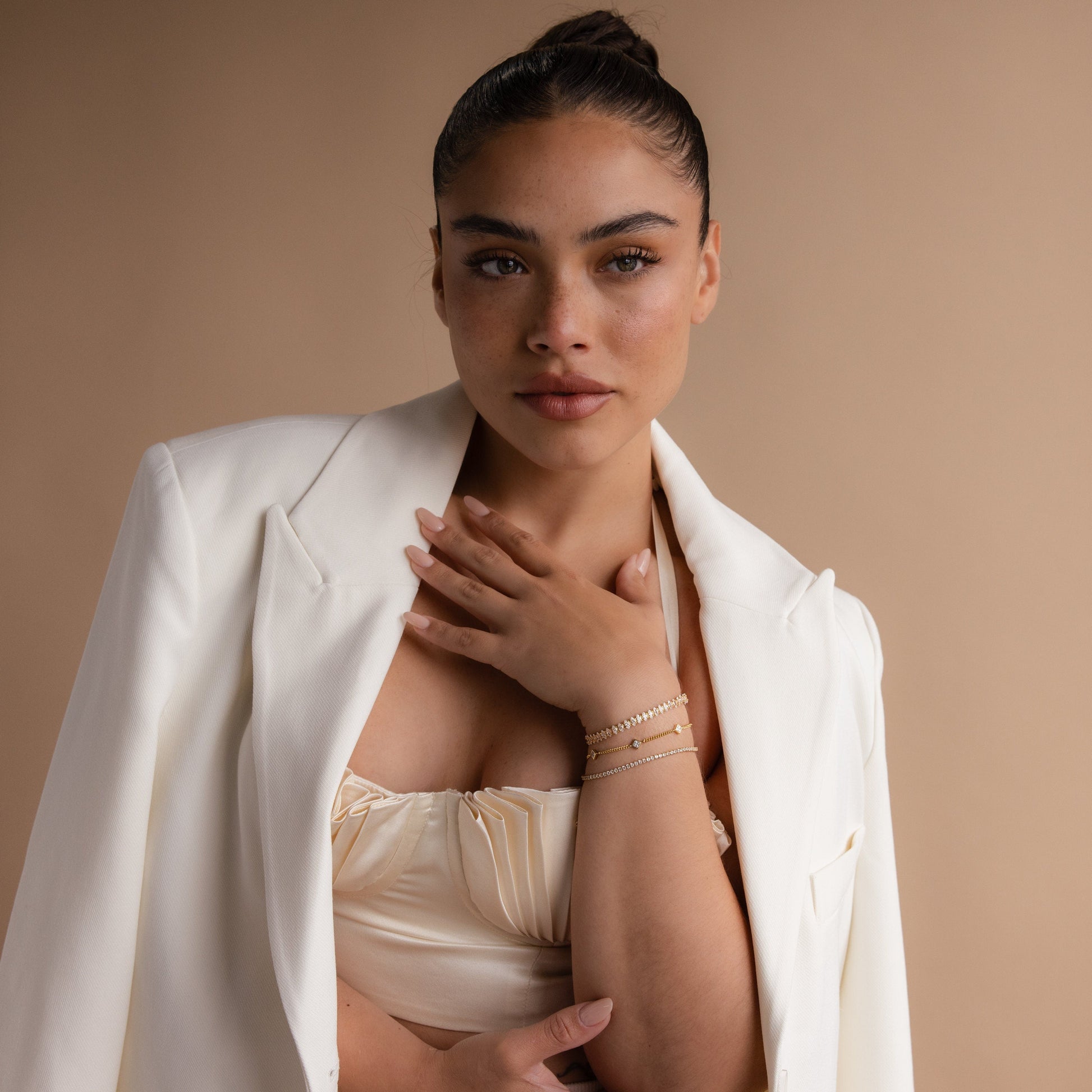 • Model showcases a shimmering crystal look featuring our  and .