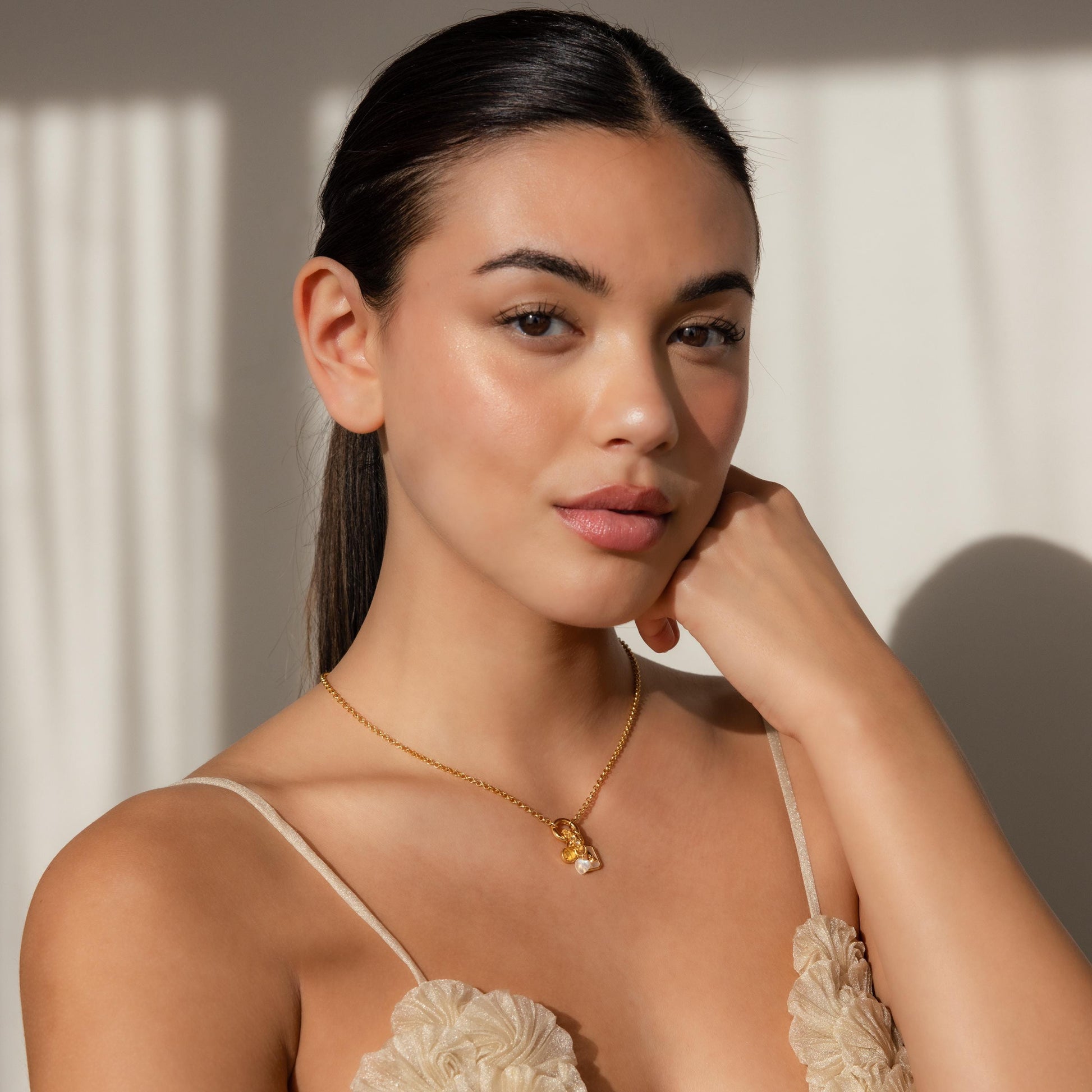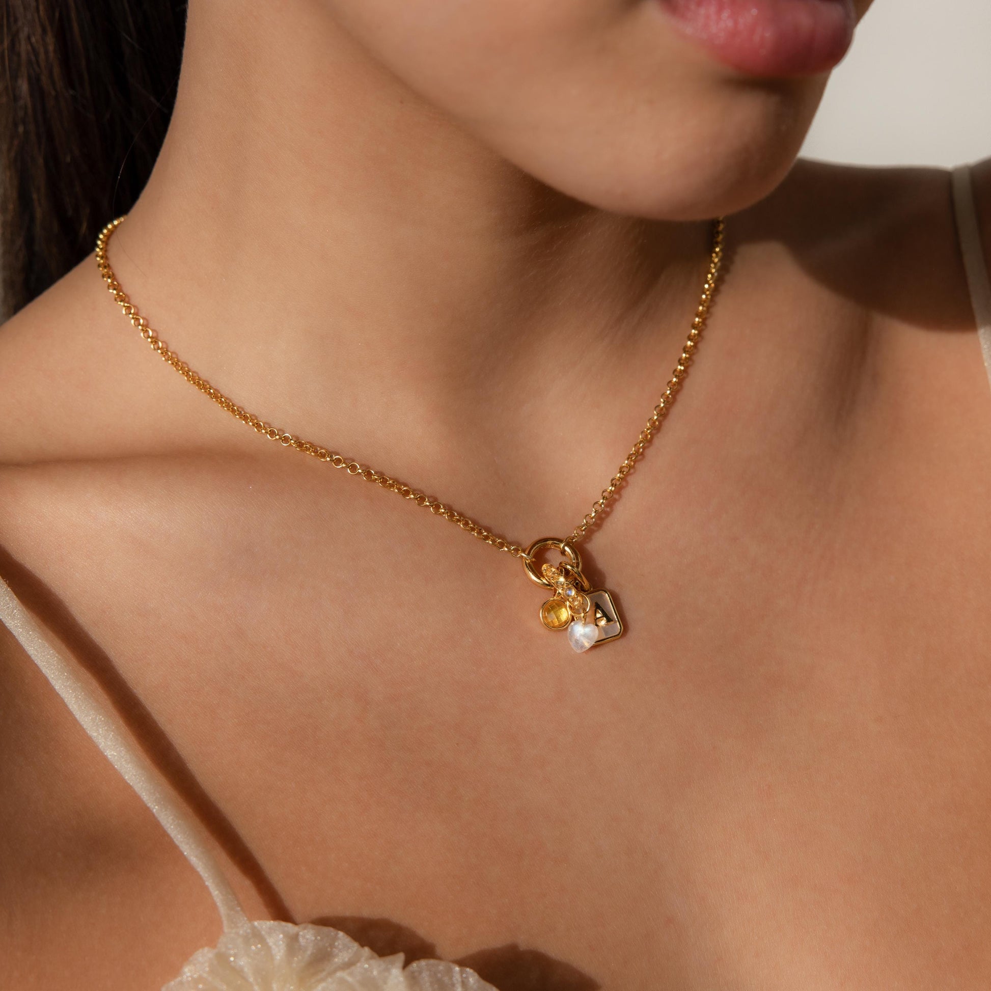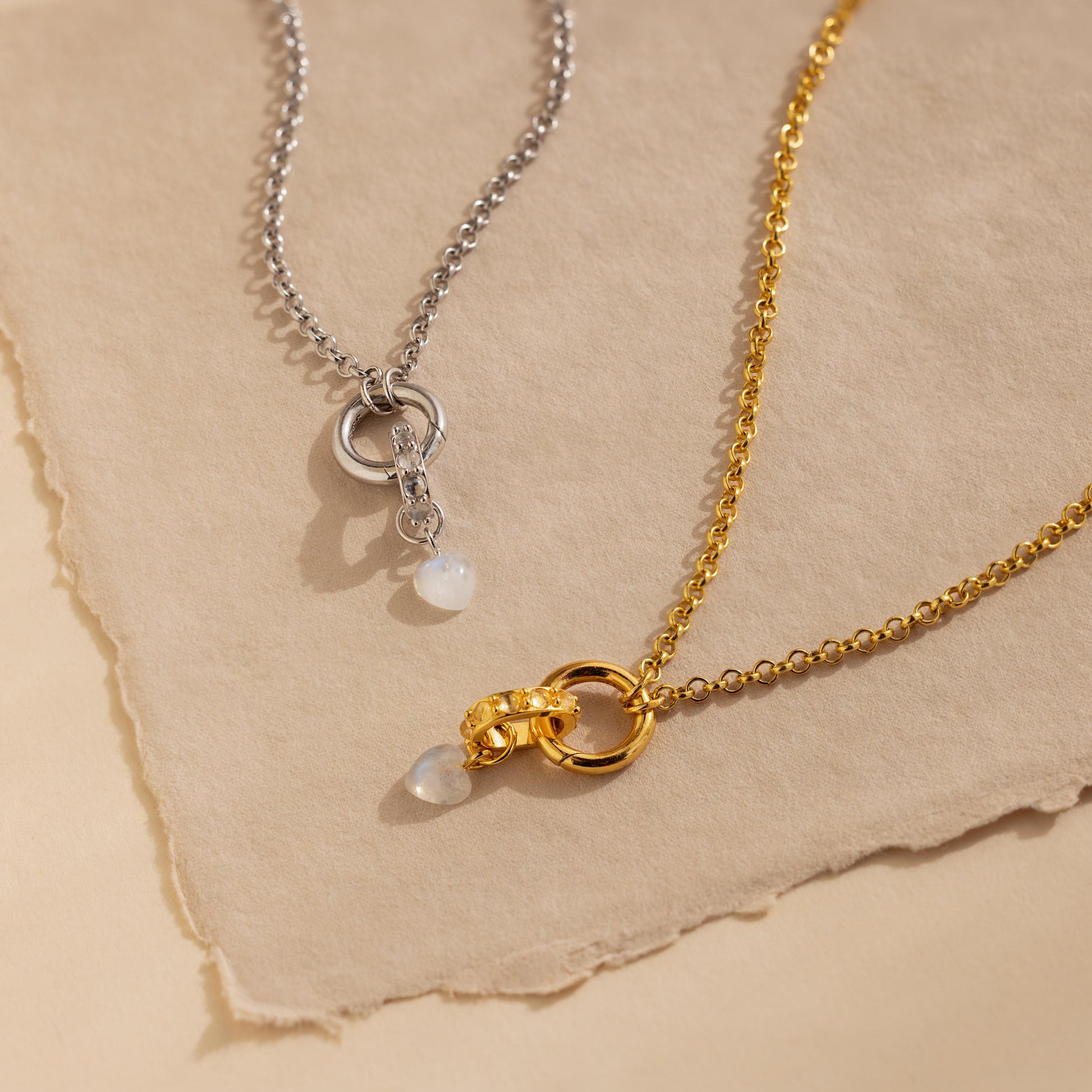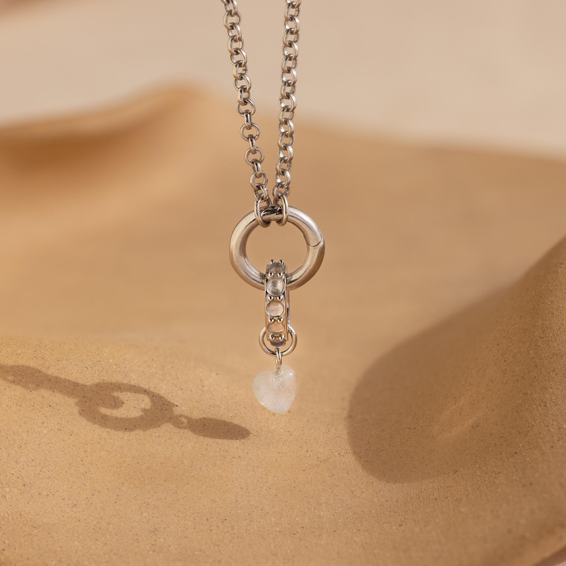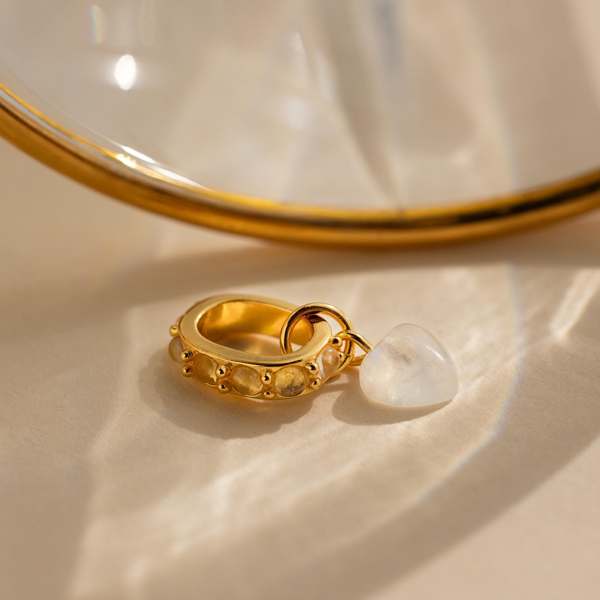 Our dainty Moonstone Heart Charm is a tiny treasure with an enchanting design. Featuring a sleek hoop adorned with moonstone gems and a dangling heart-shaped charm, it radiates a dreamy, iridescent glow. Perfect for mixing and matching on your favorite chain!