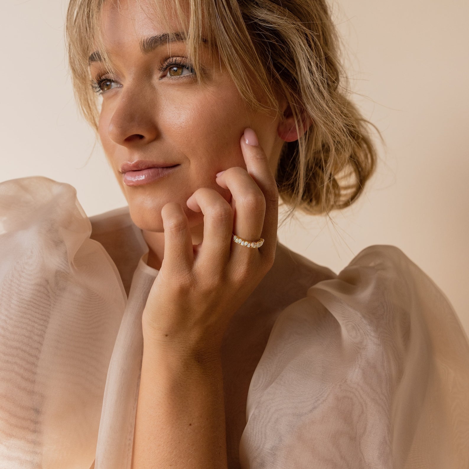 • Featuring pear shaped Opal Gemstones alternating on a sleek Gold ~1.5-3.5mm band