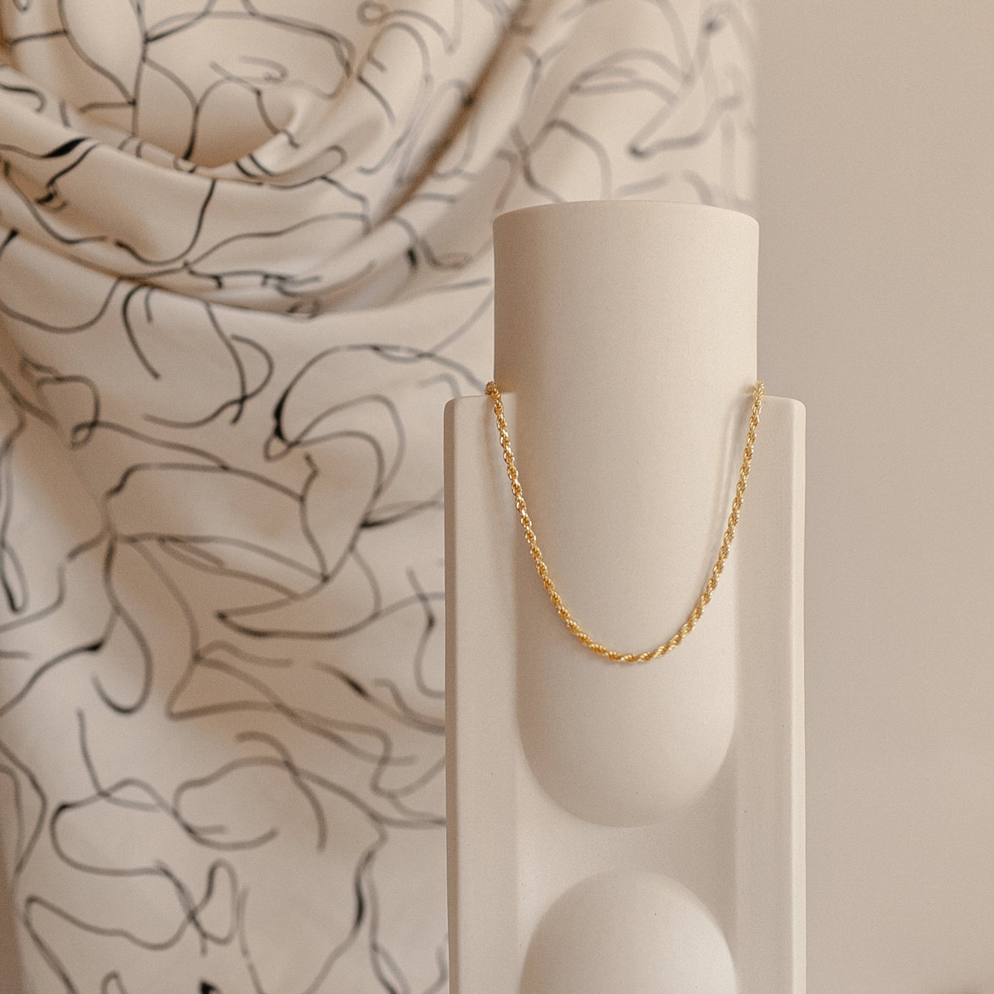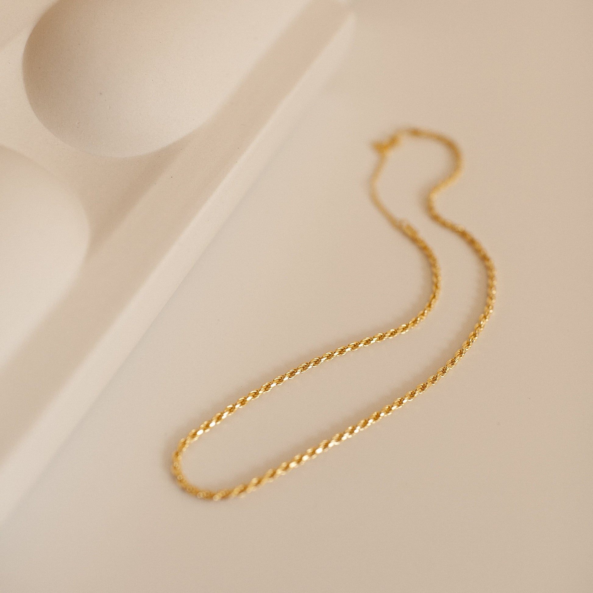 Our Rope Chain Necklace, as its name suggests, is linked in a twisted pattern to resemble a rope. This timeless, staple piece is a simple and understated way to bring elegance to any ensemble. Add instant sparkle to your look, while never overpowering your clothing with this classic jewelry choice.