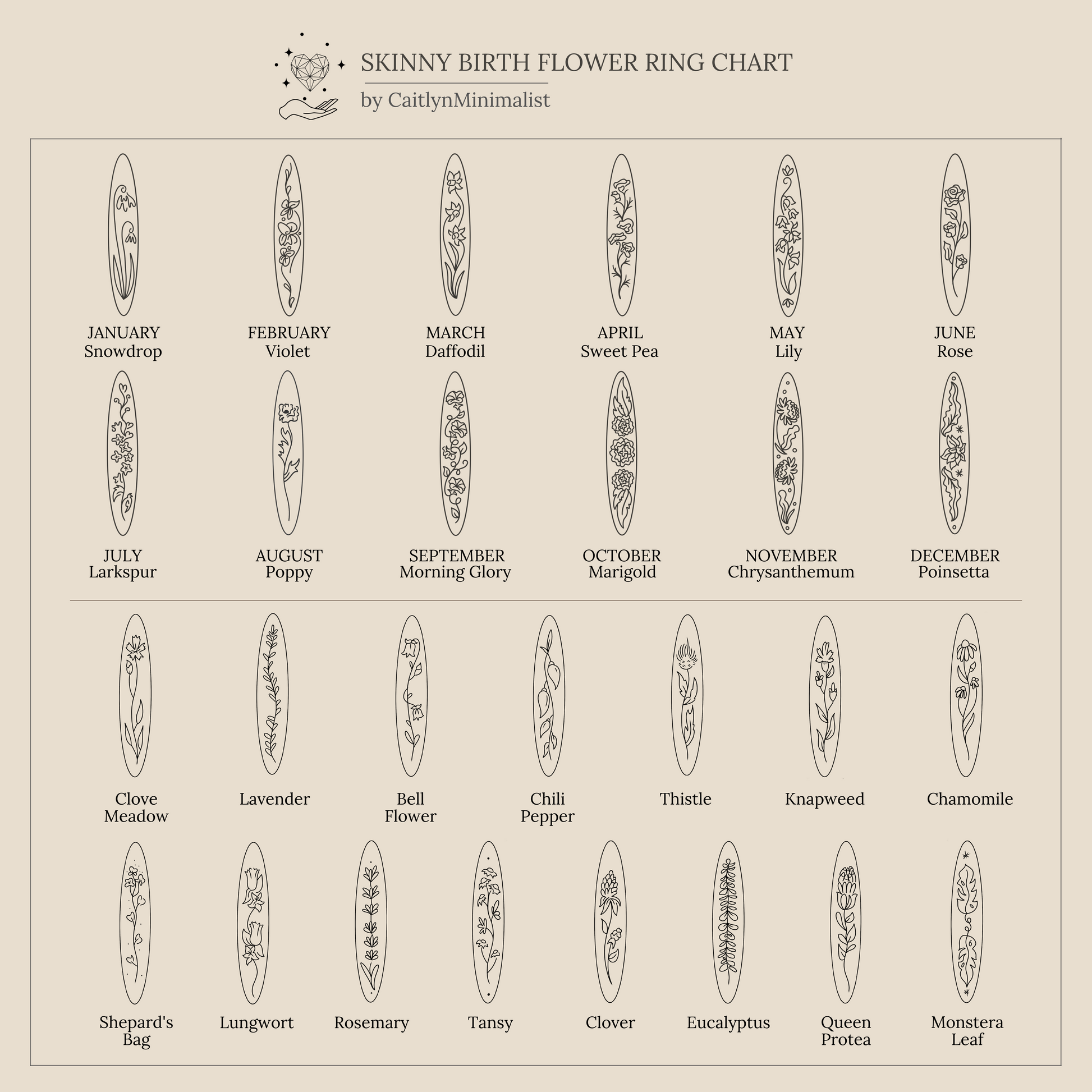 Joining our botanical collection, we present our Flower Band ring. We took some most-loved floral and herbal plants and created a full design to fit on a skinny band. Wear one for a cute and minimal look, or stack multiple if you can’t decide on just one! Add a hidden message on the inside to give it a meaningful touch.