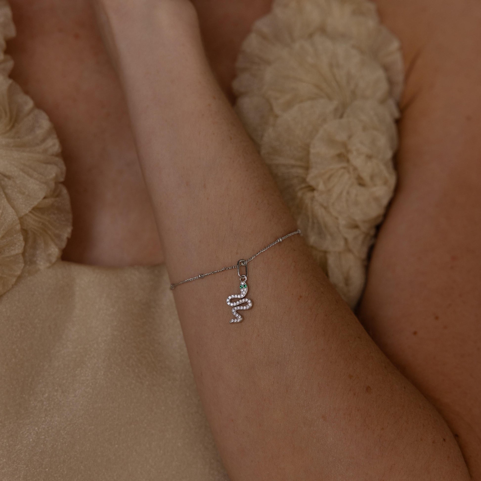 Add a hint of mystery with our Diamond Snake Charm, decorated with shimmering Diamond Pave stones and captivating green Emerald eyes. A bold yet elegant treasure, it gives an enchanting edge to any bracelet or necklace!