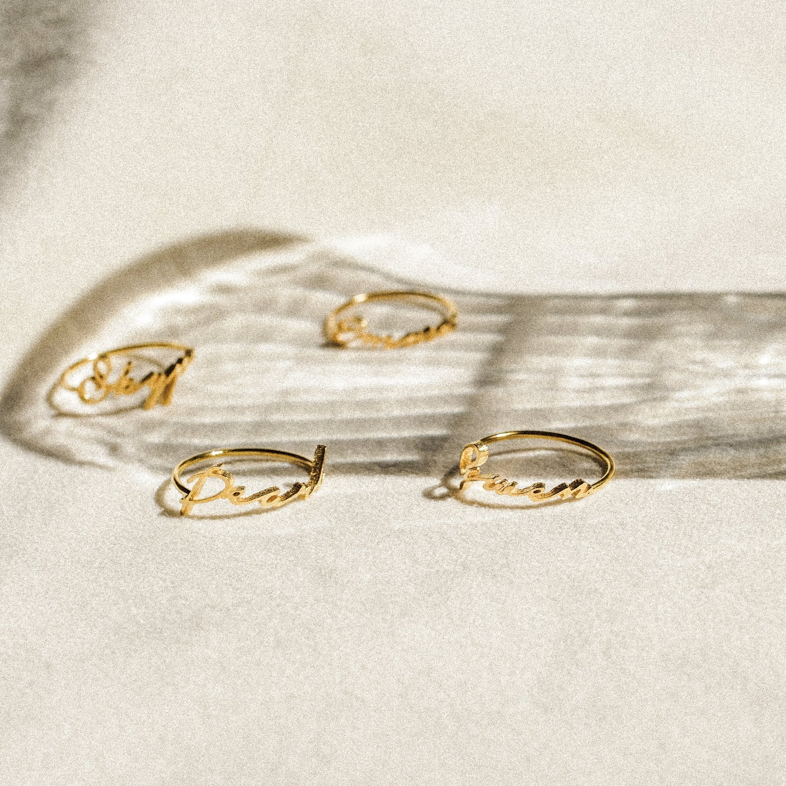 Design our Venice Script Name with your name, nickname, or your bestie’s name to create a personalized piece that feels both timeless and contemporary at the same time. Layer with a few other delicate bands to create a softly bold look.