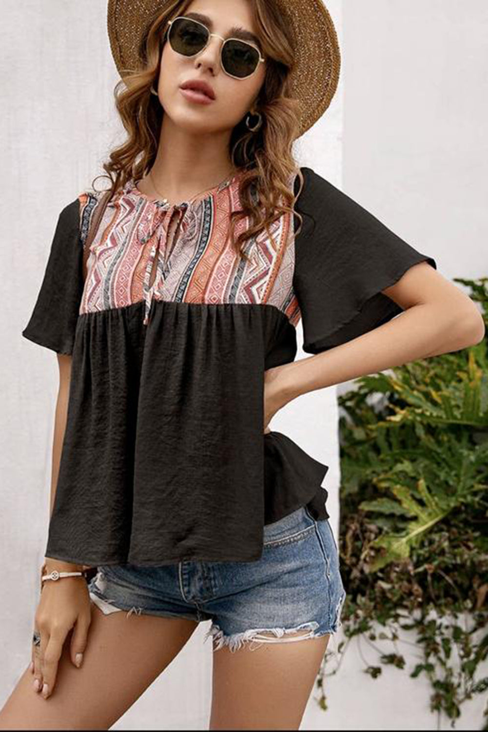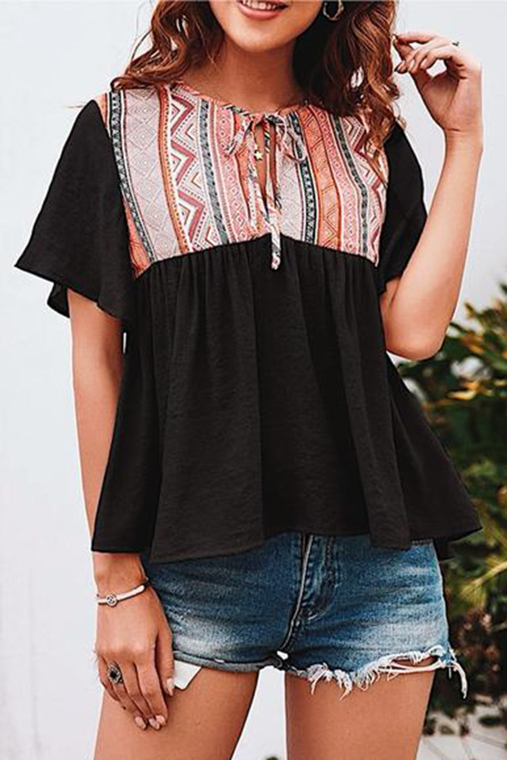 Western Serape Patchwork Flounce Short Sleeve Top